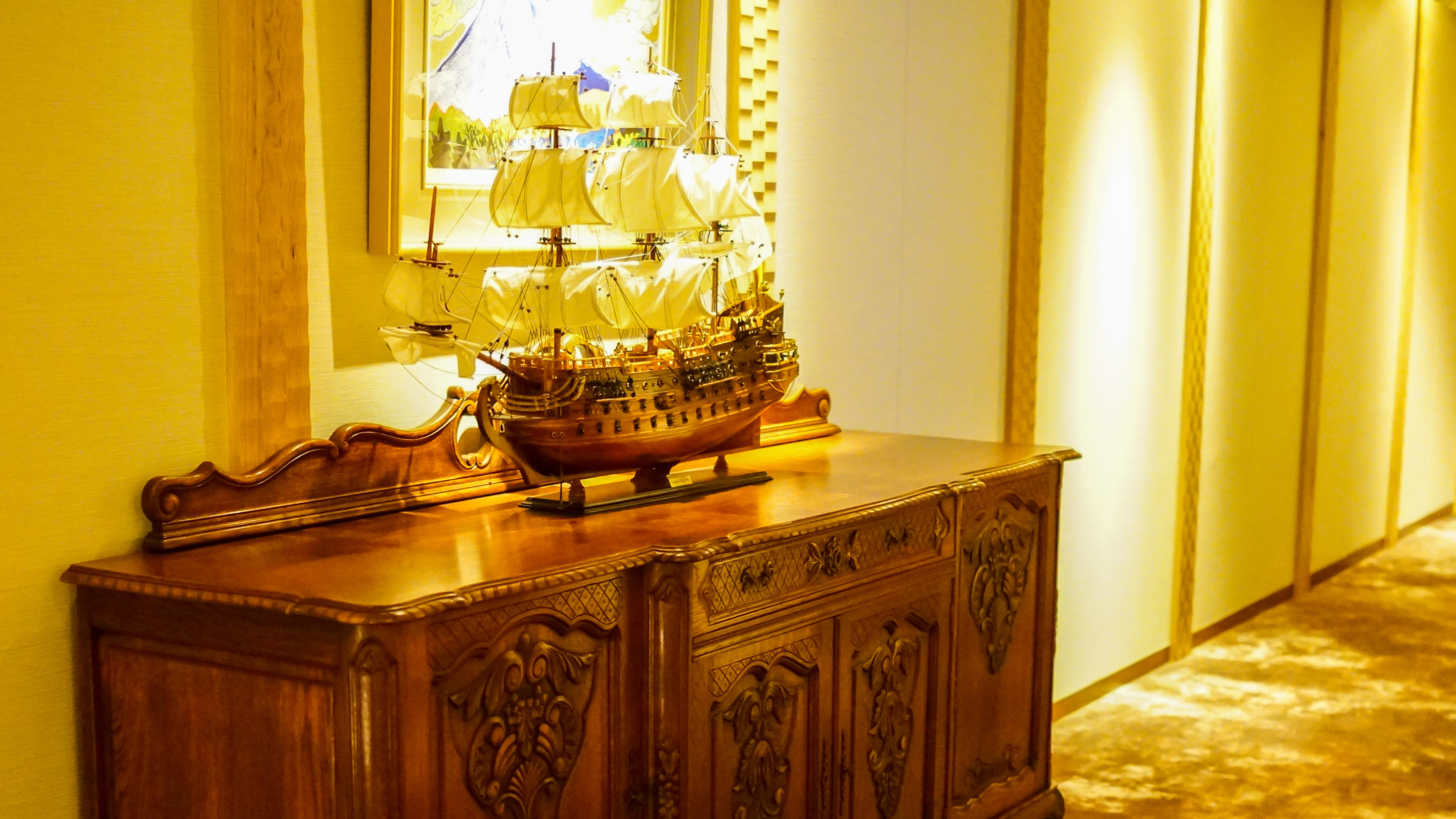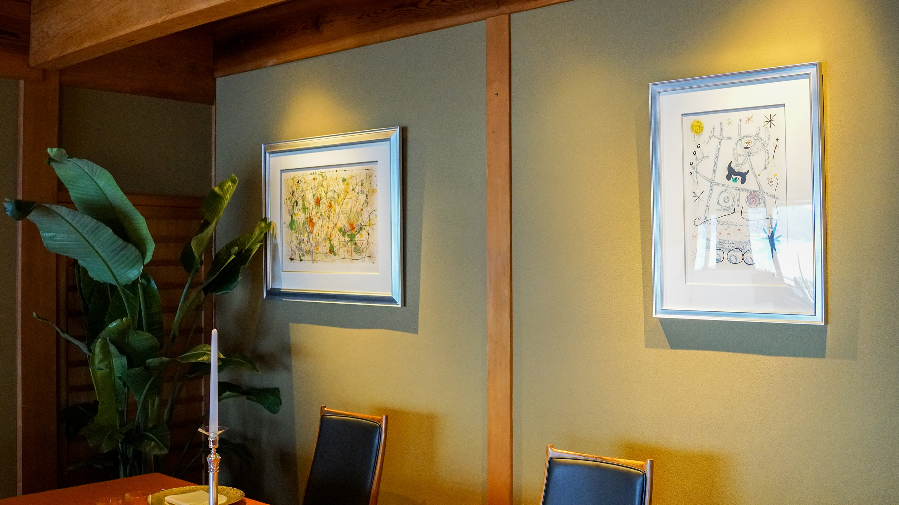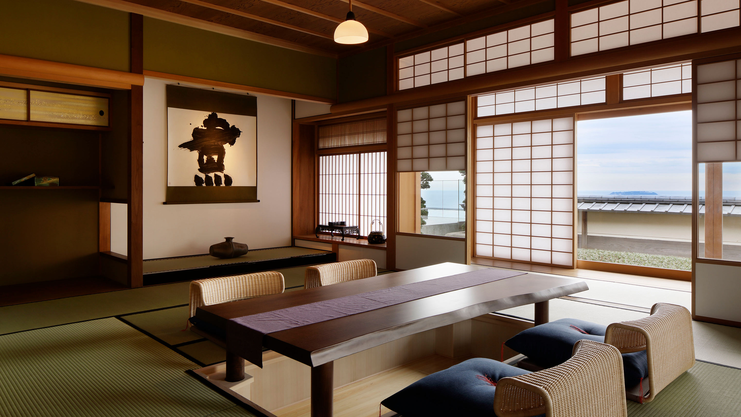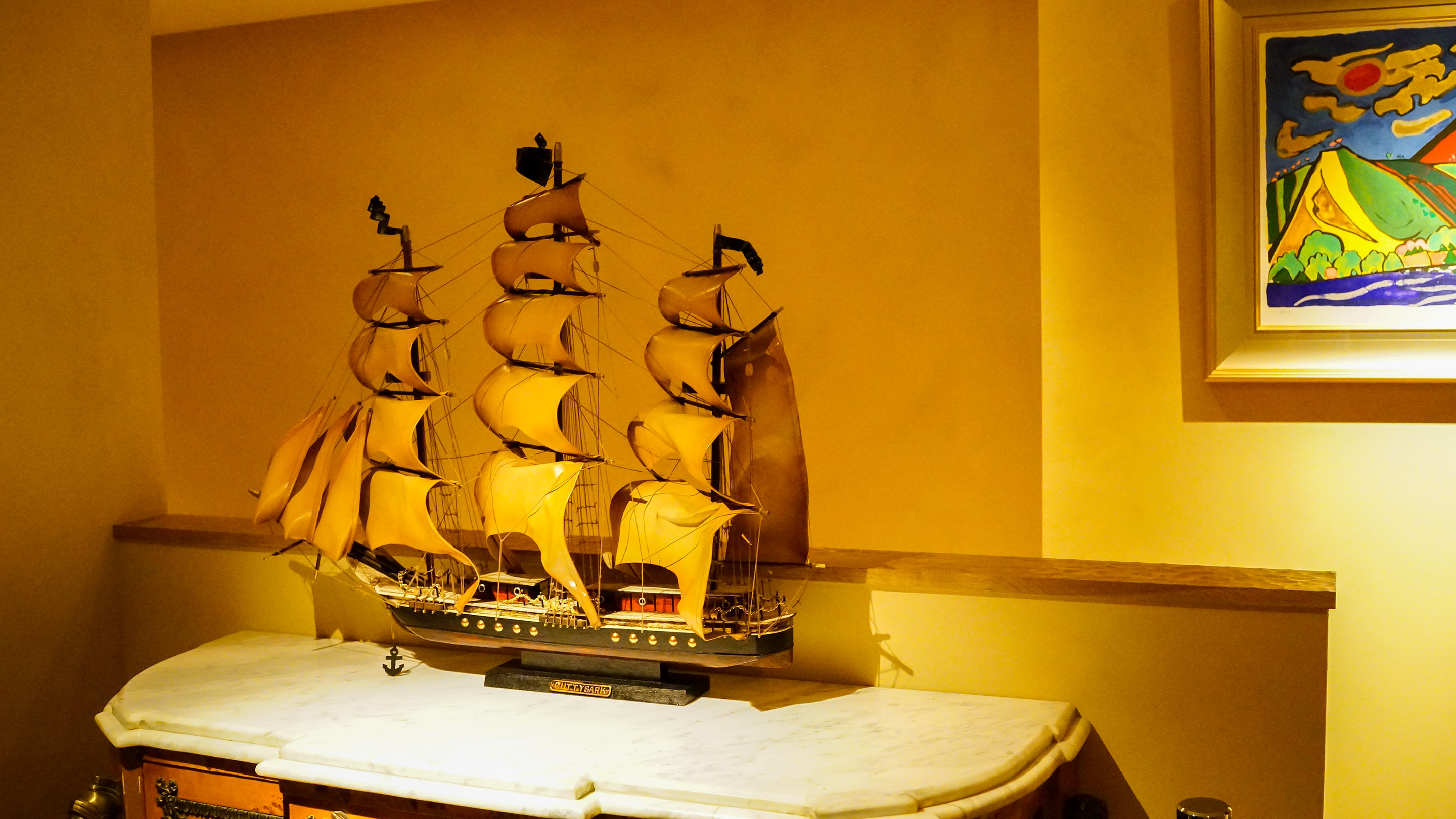 館内のラウンジに足を踏み入れると、目の前には相模湾。天井には、長さ20メートルはあろうかという見事な一木の梁。あちらこちらにジョアン・ミロの絵画や片岡球子の富士山の絵が飾られ、心を和ませる。客室をはじめ、所々に置かれた精巧な帆船の模型にも目が吸い寄せられた。さらに、書や蒔絵の文箱など、多くの美術品が惜しげもなく展示されているところに、格式の高さまで伺える。