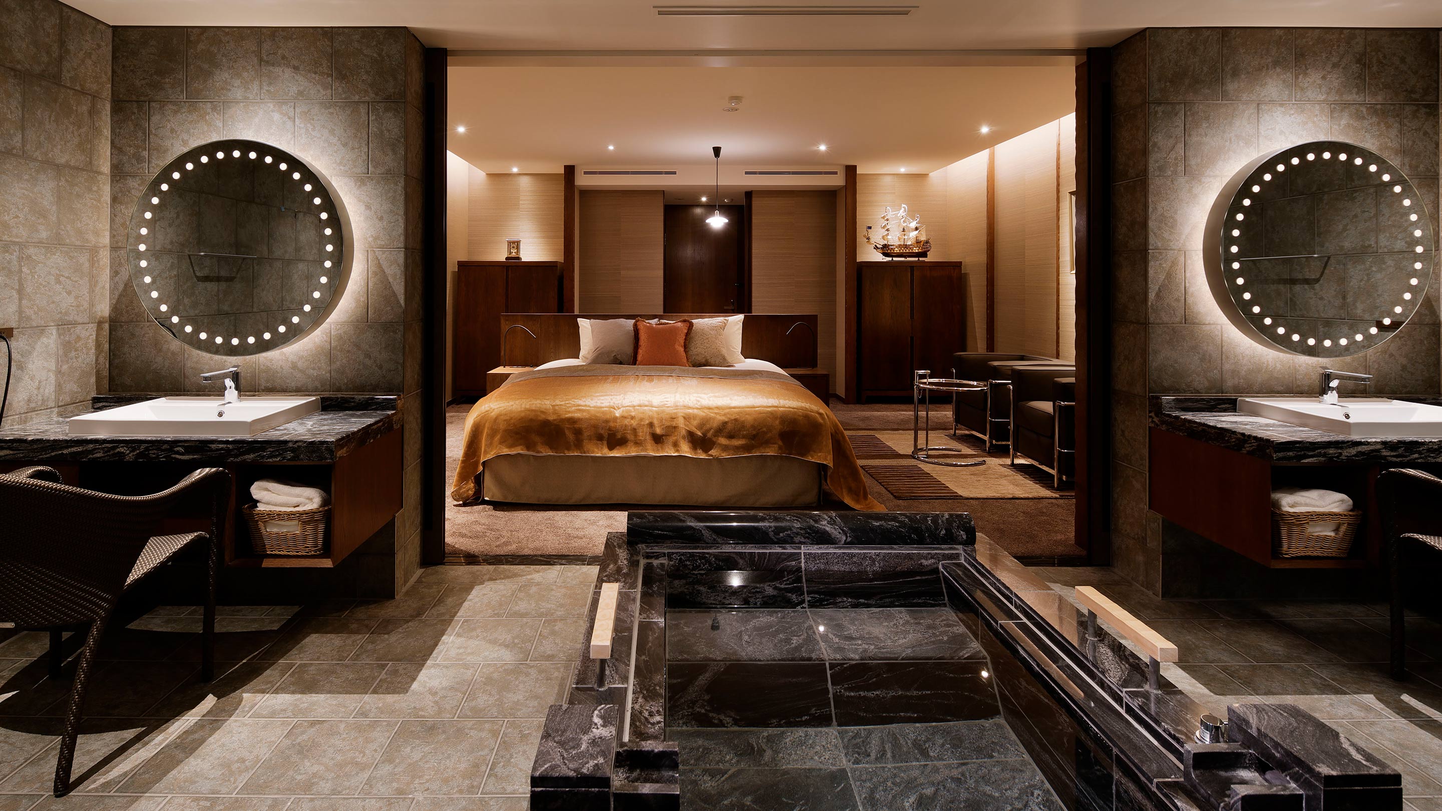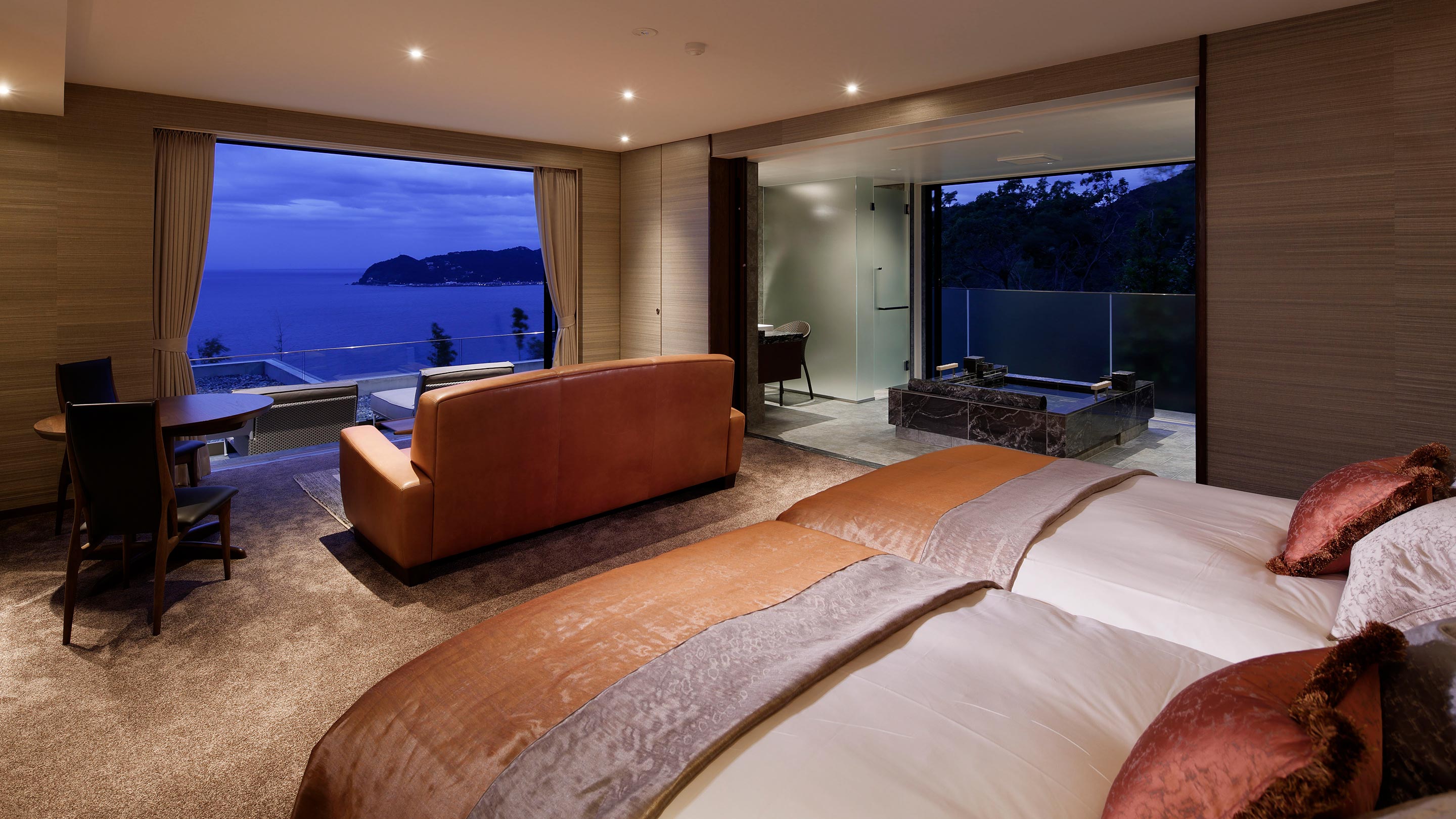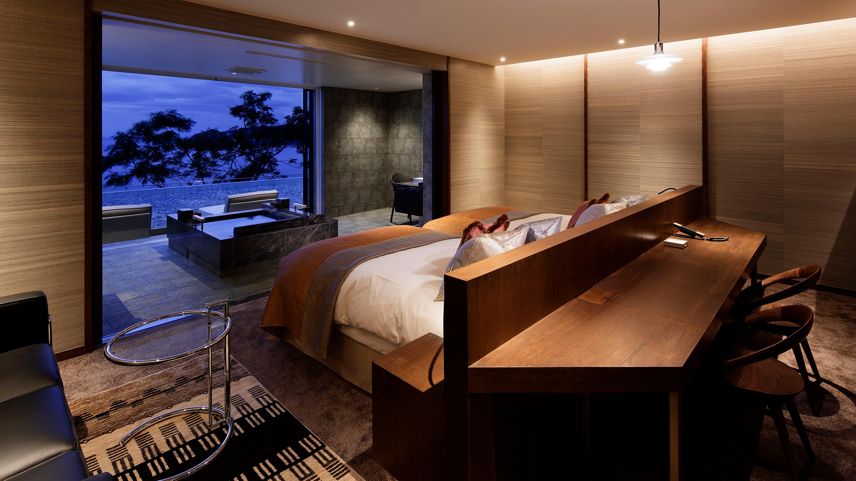 客室は全部で13室。3階の両端に特別室2室が配され、2階に4室、1階に7室の客室が配されている。それぞれの階にある角部屋は85㎡とかなり広め。リビングとベッドルームとバスルームが一体となったような構成で、バスタブには24時間、いつでも入れるように温度調節された温泉が張ってある。バスタブに浸かりながら海を眺めていられるので、その心地よさに、つい出るのを忘れてしまう。客室にいながらバスルームで日の出を楽しめる、稀有なオーベルジュと言ってよい。
