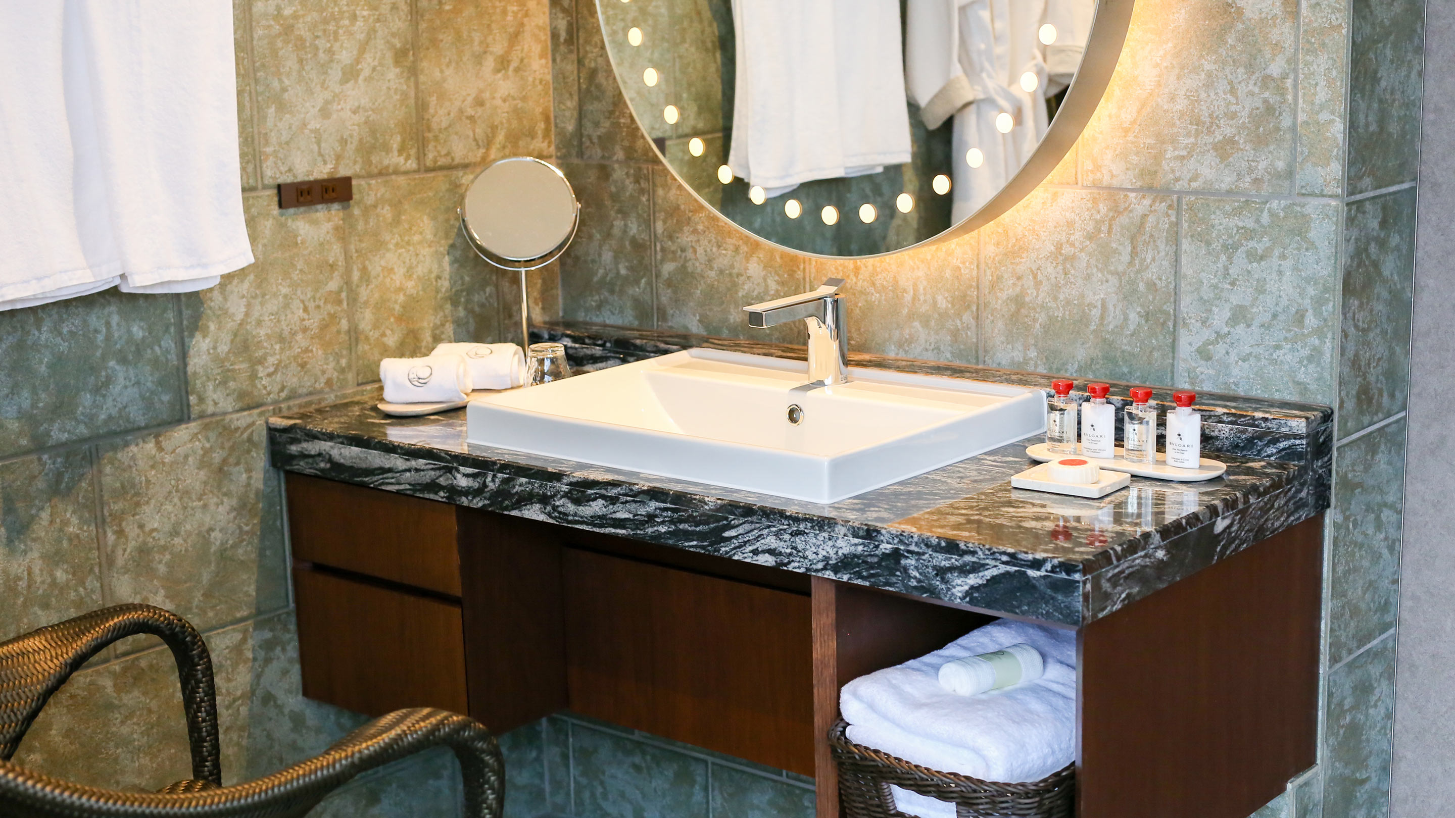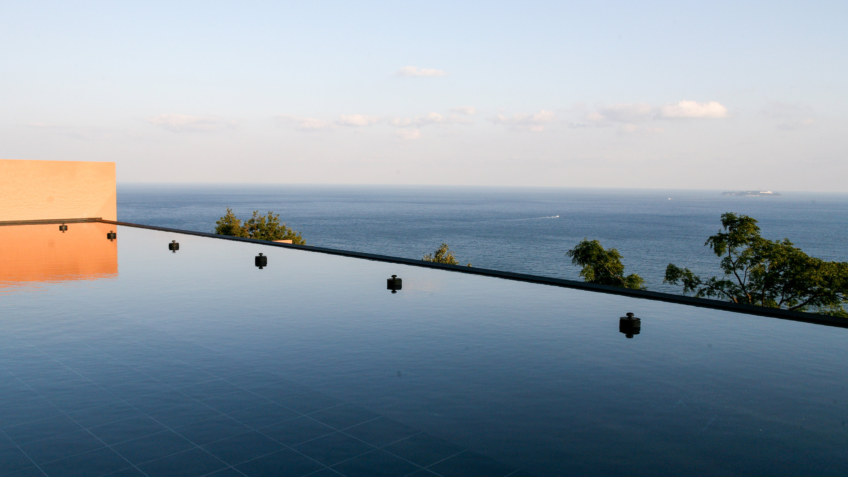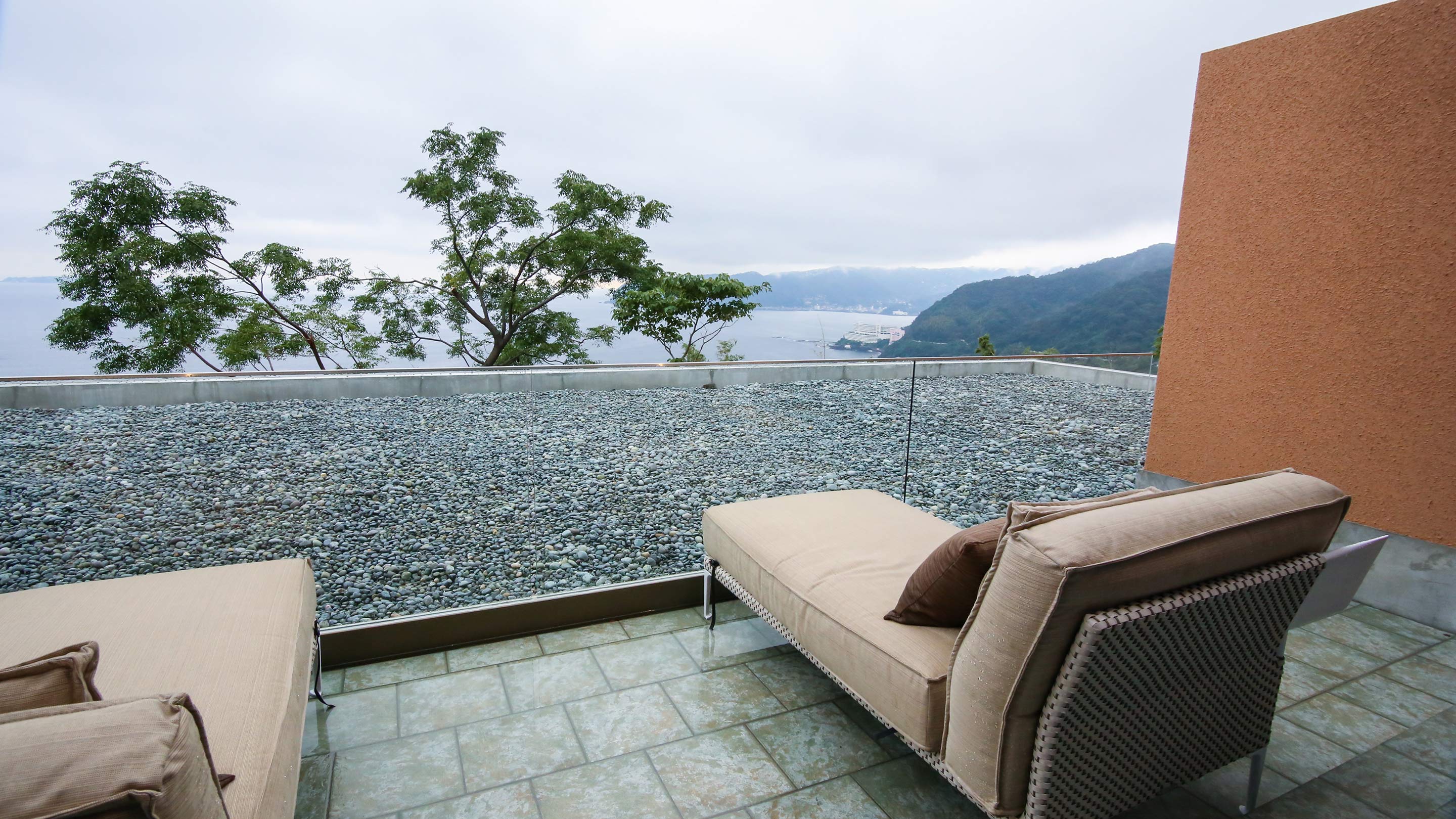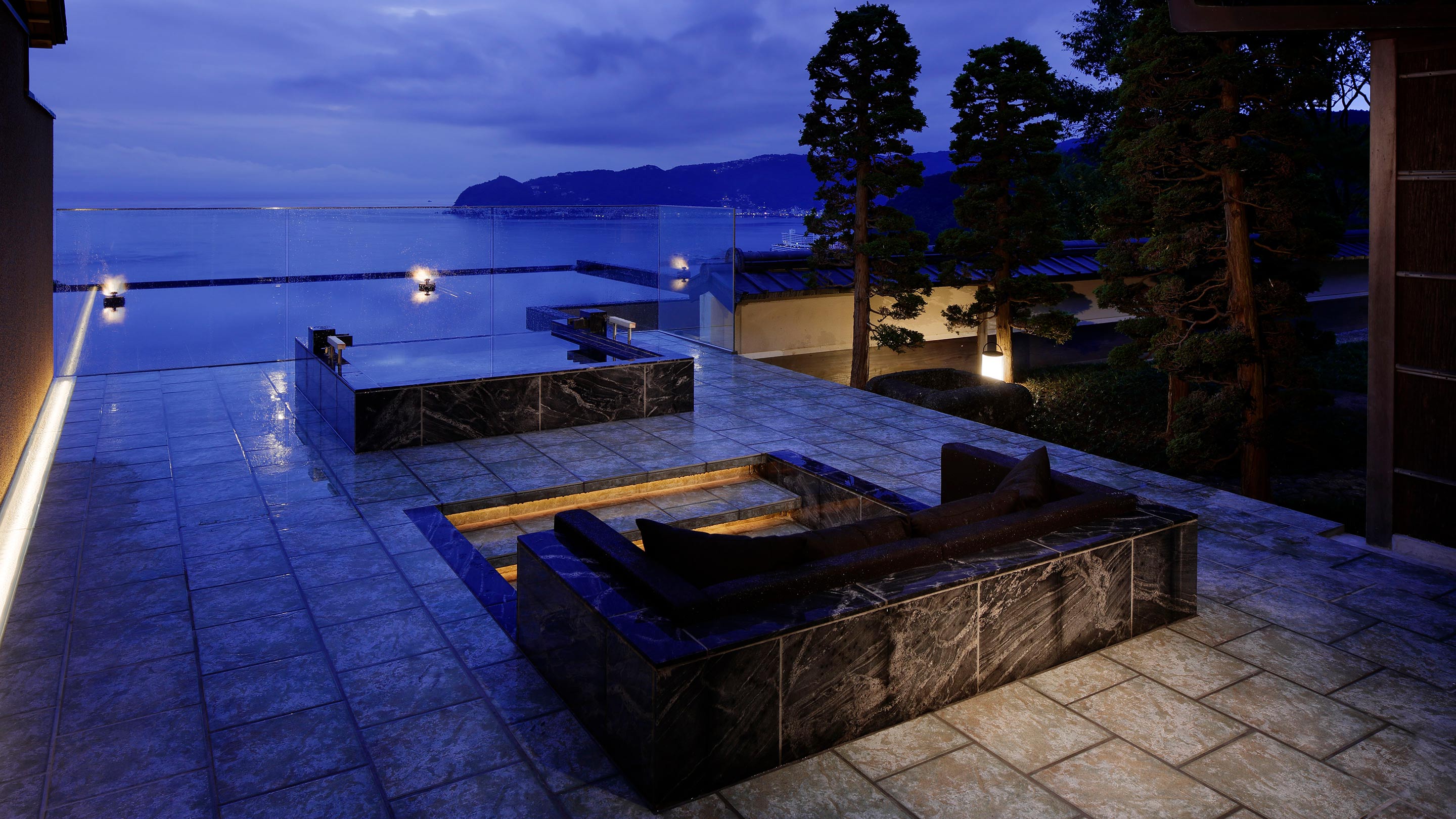 客室は全部で13室。3階の両端に特別室2室が配され、2階に4室、1階に7室の客室が配されている。それぞれの階にある角部屋は85㎡とかなり広め。リビングとベッドルームとバスルームが一体となったような構成で、バスタブには24時間、いつでも入れるように温度調節された温泉が張ってある。バスタブに浸かりながら海を眺めていられるので、その心地よさに、つい出るのを忘れてしまう。客室にいながらバスルームで日の出を楽しめる、稀有なオーベルジュと言ってよい。